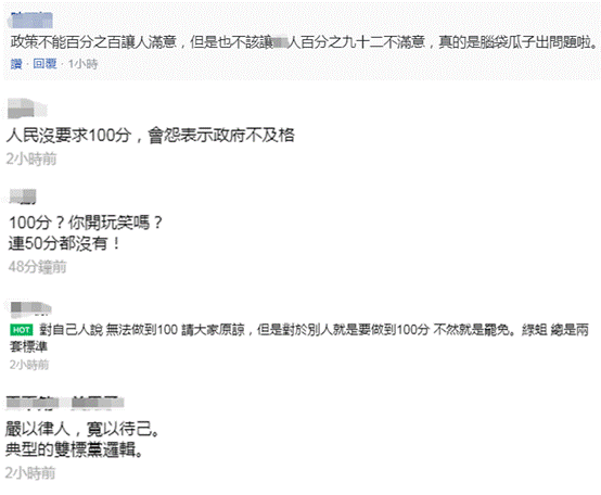 對於這一說法,有島內網民怒稱,政策不能百分之百讓人滿意,但是也不該讓百分之九十二的民眾不滿意,真的是腦袋瓜子出問題啦。100分,你開玩笑嗎?連50分都沒有。民眾沒要求100分,會怨表示不及格。還有人批評,對自己人說無法做到100分,請大家諒解,對別人就要求做到100分,不然就是罷免,綠營總是兩套標準。嚴以律人,寬以待己,典型的雙標邏輯。↓